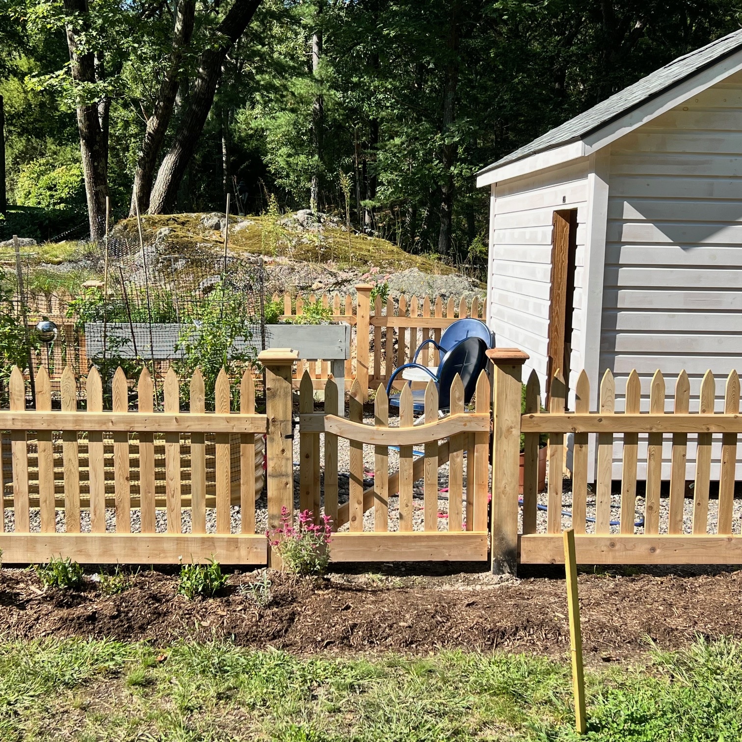 A homeowner in Weston envisioned a beautiful fence that would not only define their vegetable garden but also protect it from animals and add charm to their outdoor space